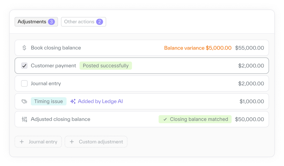 Ledge compares your books to live bank, Payment Processor, and system data, flags breaks as they happen, and suggests adjustments before they delay your close