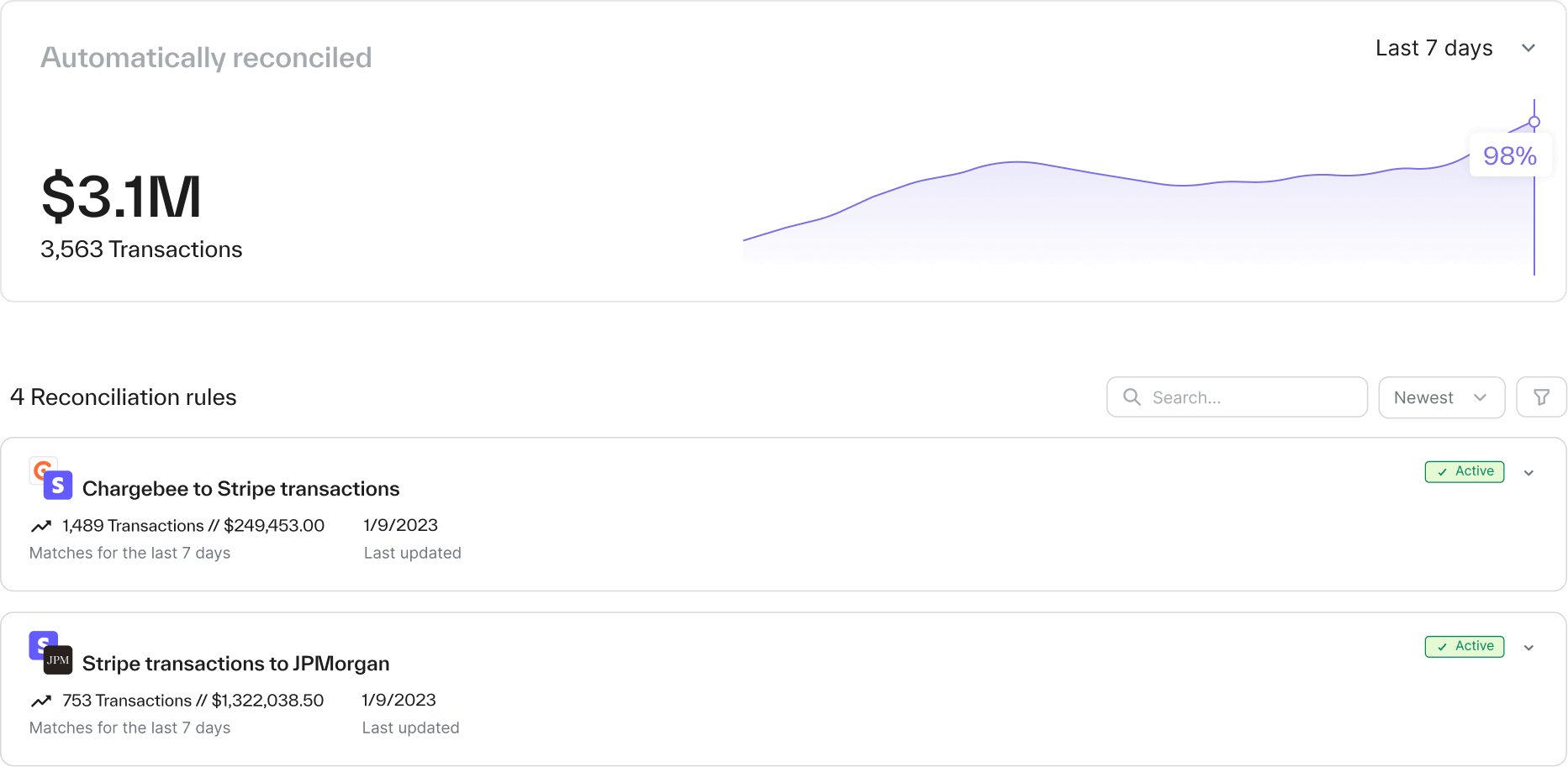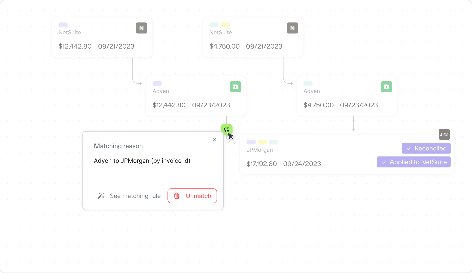 - Full matching: One-to-one, one-to-many, many-to-one, and many-to-many transaction matching for high volume, complex workflows.