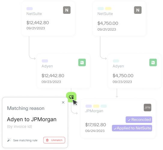 - Every transaction: Instantly match customer payments to the corresponding invoice, including partial payments, refunds, chargebacks, payment failures, & payments that cover multiple invoices.