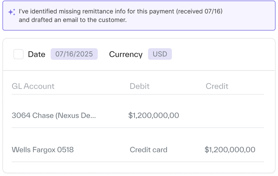 AI agents match incoming payments to open invoices, even with missing, messy, or multi-source remittances.