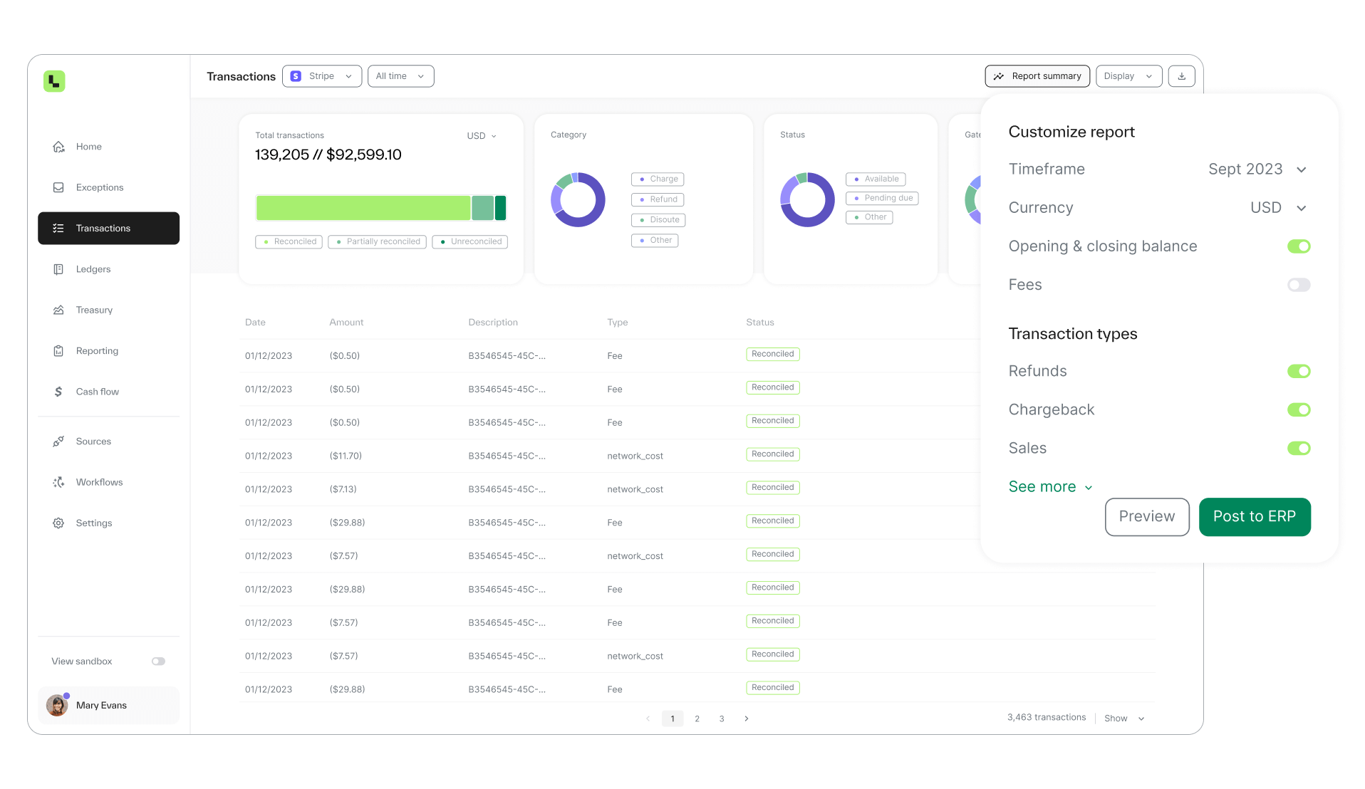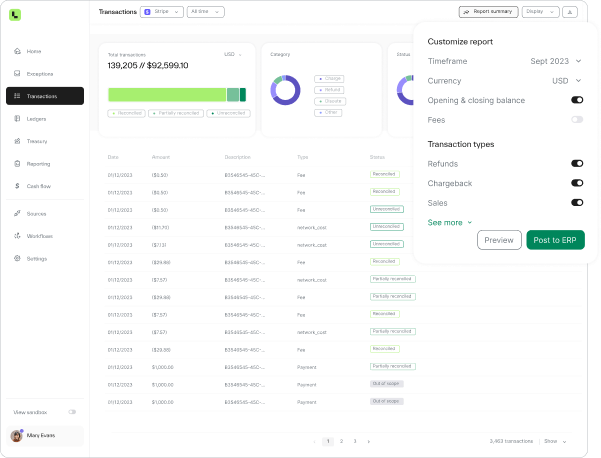 - Flexible ERP integration: Post reconciled data back to your ERP, including aggregate totals or breakdowns of revenue, fees, and taxes in journal entries tailored to suit your workflow.