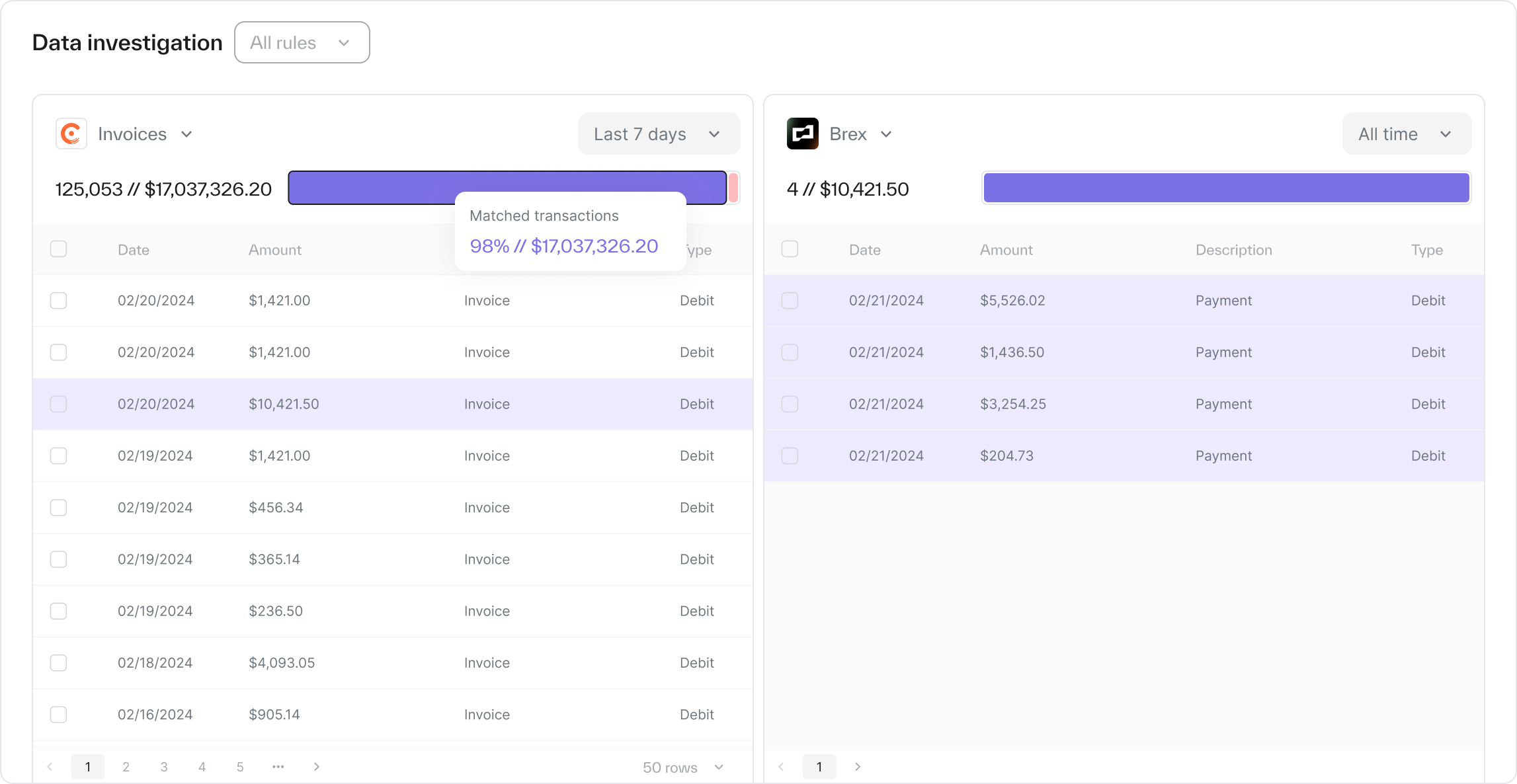 If the system doesn’t identify an exact match, it suggests options to account for scenarios like name mismatches or missing information, making it straightforward to perform investigations and quickly pinpoint the cause of the discrepancy. For teams handling a high volume of transactions, this is a huge time saver for the month-end close.