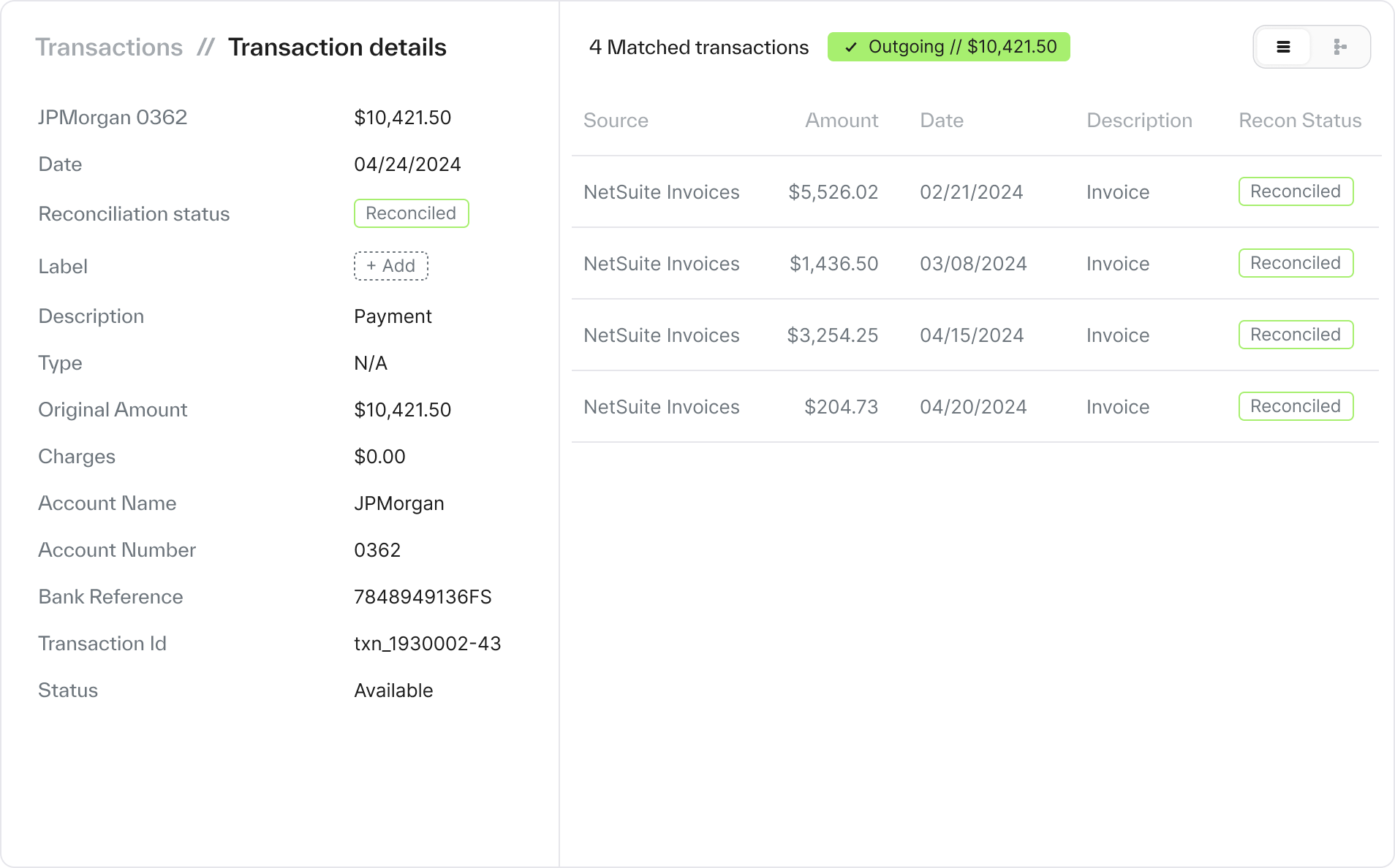 It uses AI and machine learning models to automatically match settled payments to the corresponding source, whether it’s the invoice, database, bank, PSP, or ERP. This includes partial payments, refunds, chargebacks, payment failures, and payments that cover multiple invoices (or vice versa, one invoice that’s attached to multiple payments.)