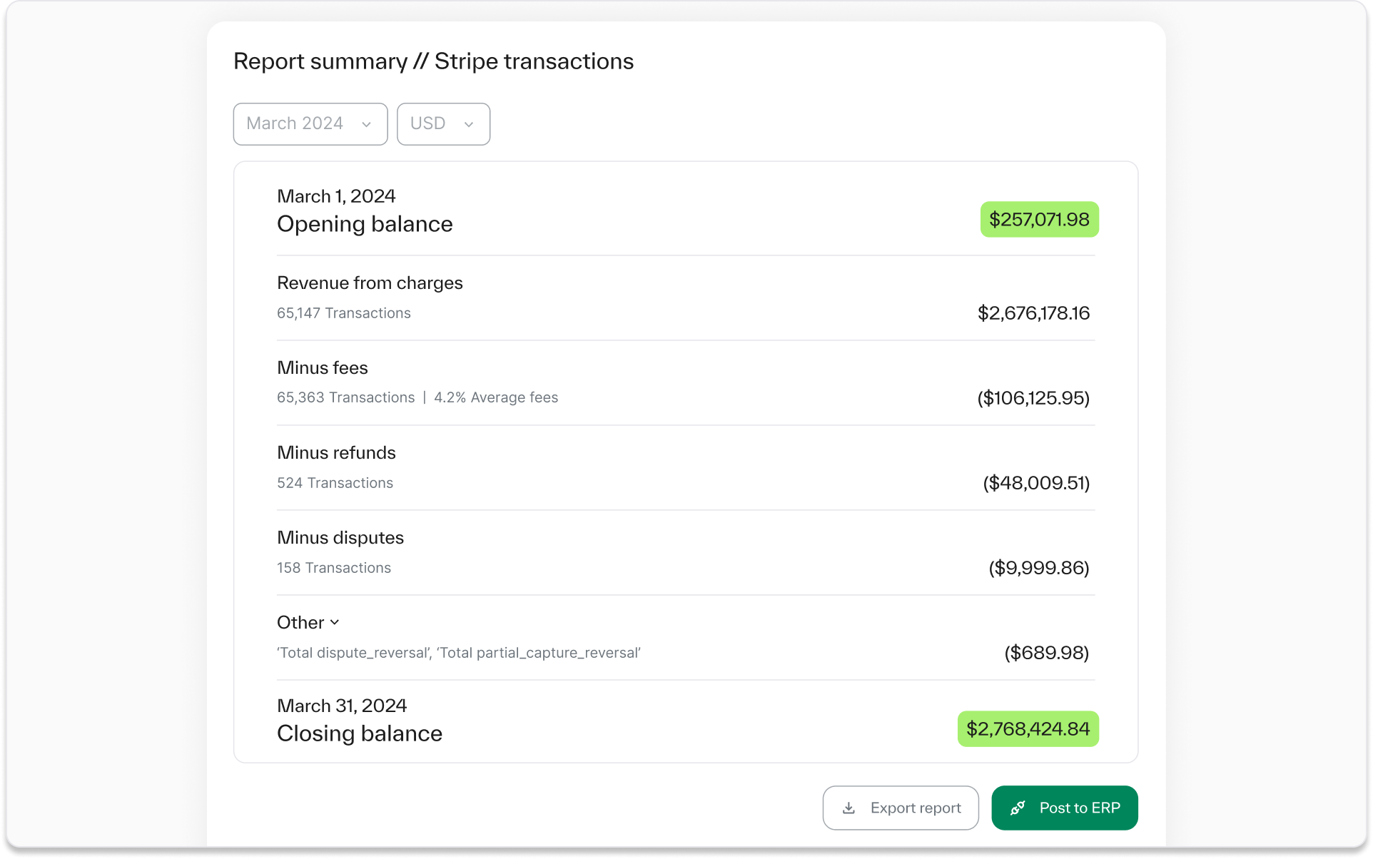 Look for software that can handle any scale and easily integrate across hundreds of bank accounts, PSPs, databases, invoicing and billing systems and your ERP, and make sure that it captures every detail of every transaction, including fees, taxes, refunds, chargebacks, points and rewards, discounts, take rates, and commissions.