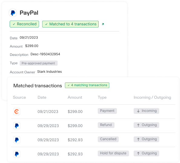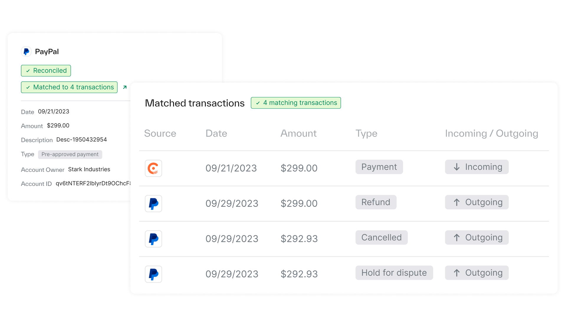 - Match every invoice: Instantly match settled payments to the corresponding invoice, including partial payments, refunds, chargebacks, currency conversion, payment failures, & payments that cover multiple invoices.