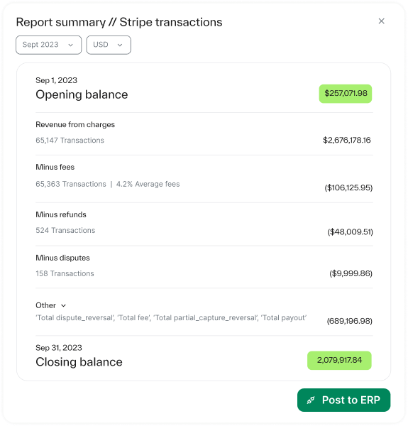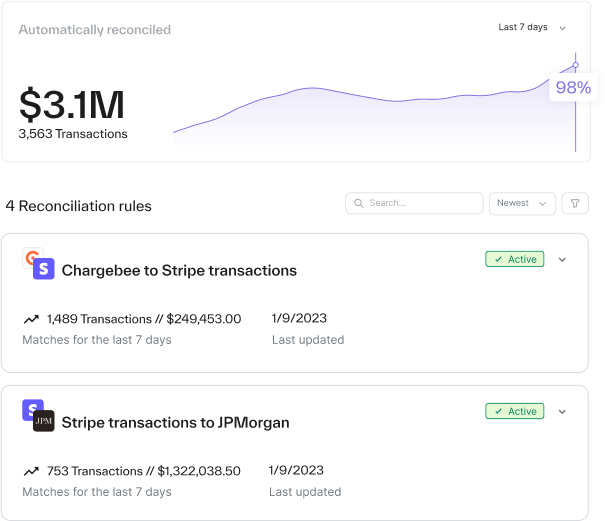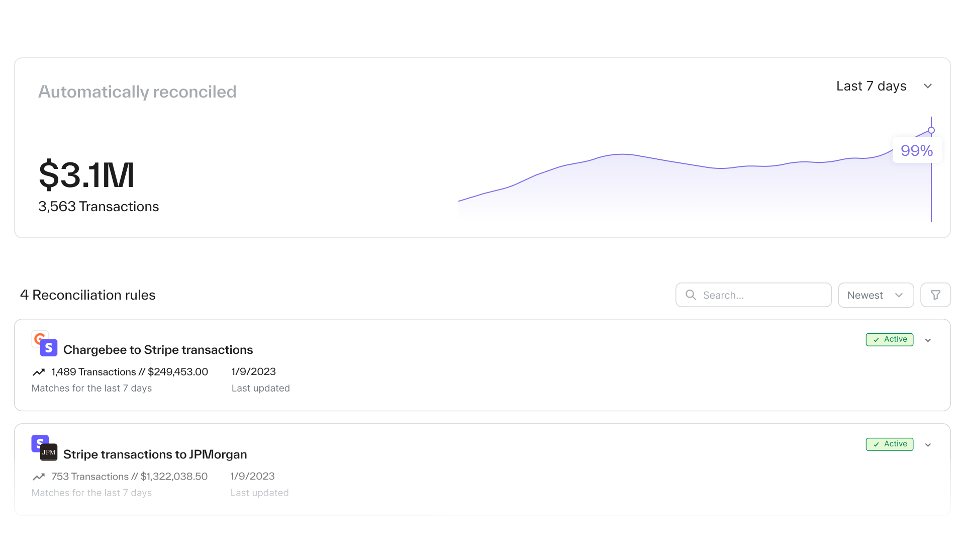 - Manage a diverse stack: Reconcile transactions across multiple PSPs, banks, and billing solutions through one-to-one, one-to-many, many-to-one, & many-to-many matching.