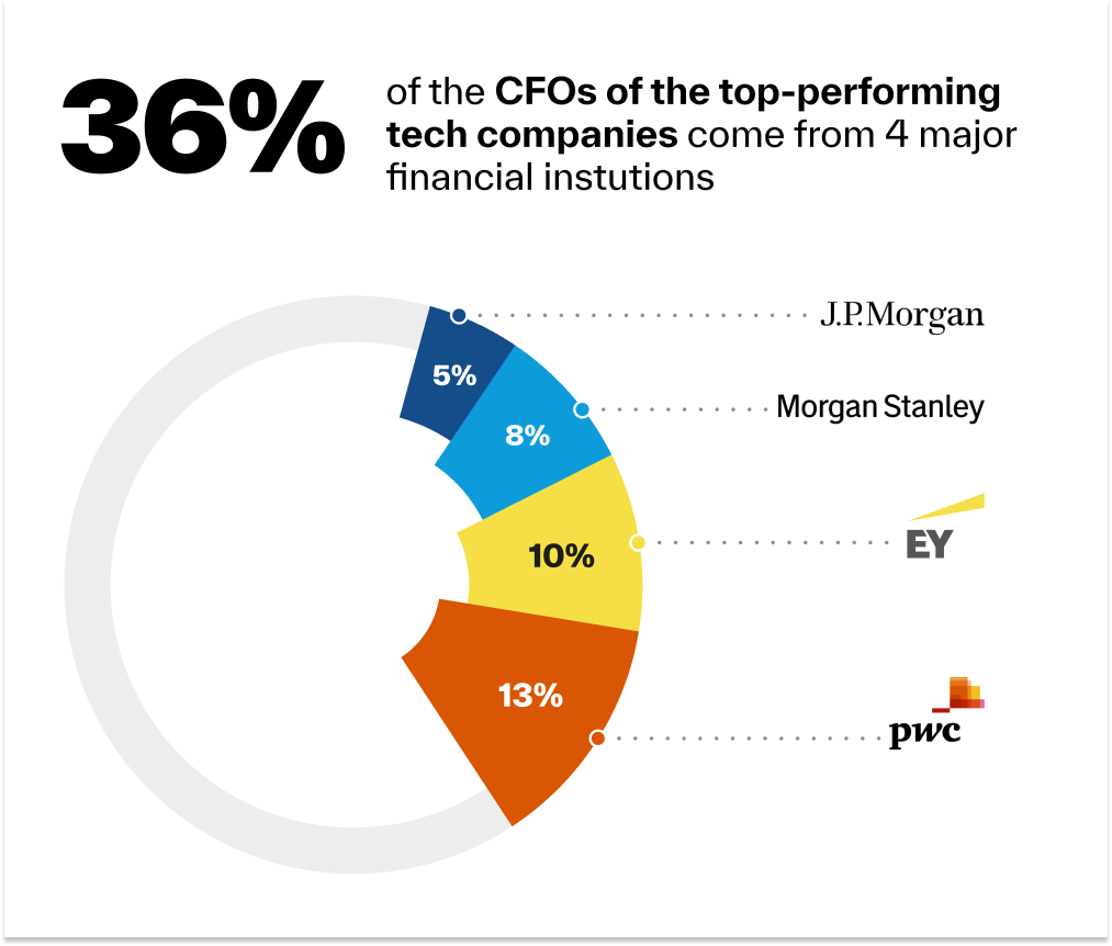 • 36% of all the CFOs come from 4 major financial institutions: 13% worked at PwC, 10% worked at EY, 8% worked at Morgan Stanley, 5% worked at JP Morgan