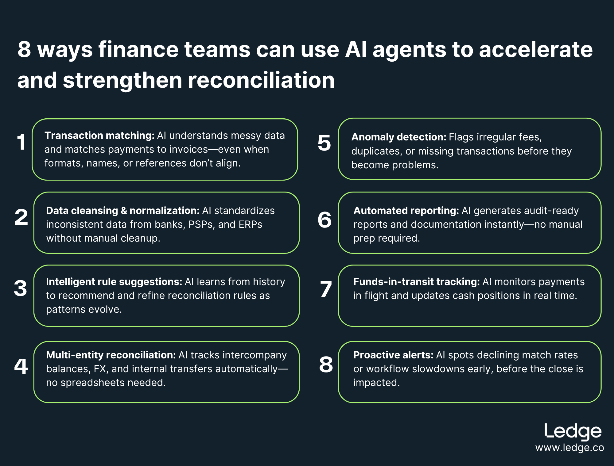 Here are 8 specific AI reconciliation workflows that are possible to accomplish with Ledge.