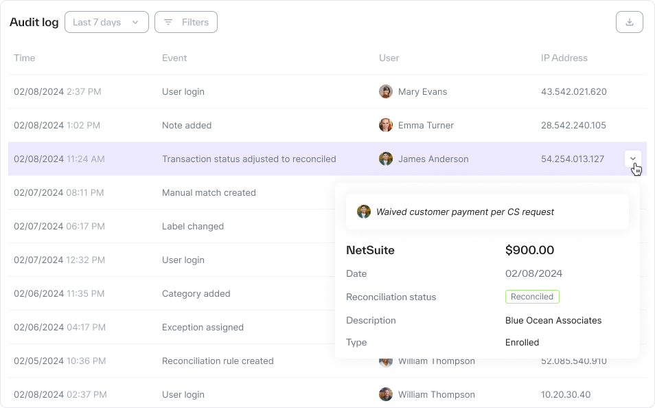 Because everything is recorded in Ledge with a comprehensive audit log, documenting everything ranging from when a certain rule was created to who did a manual match and why, the auditor has total transparency into your operations and can review it all themselves.