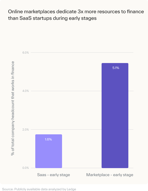The data shows that full-time finance employees of early marketplaces make up an average of 5.1% of total headcount in early stages, compared to 1.6% in early-stage SaaS companies — that's three times bigger.
