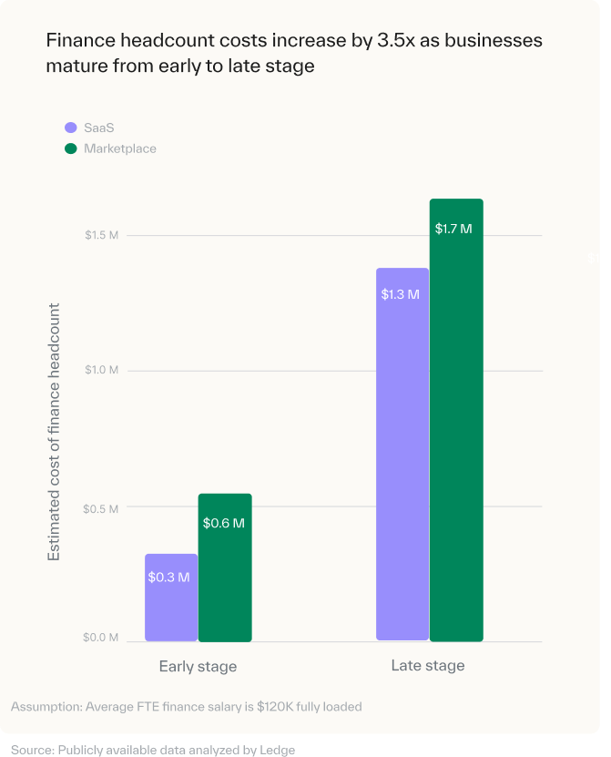 Assuming that the average fully-loaded salary of a finance employee is $120K a year and stays static as the company grows, that means that finance headcount costs increase by nearly 3.5x as both marketplaces and SaaS companies mature from early to later stage.