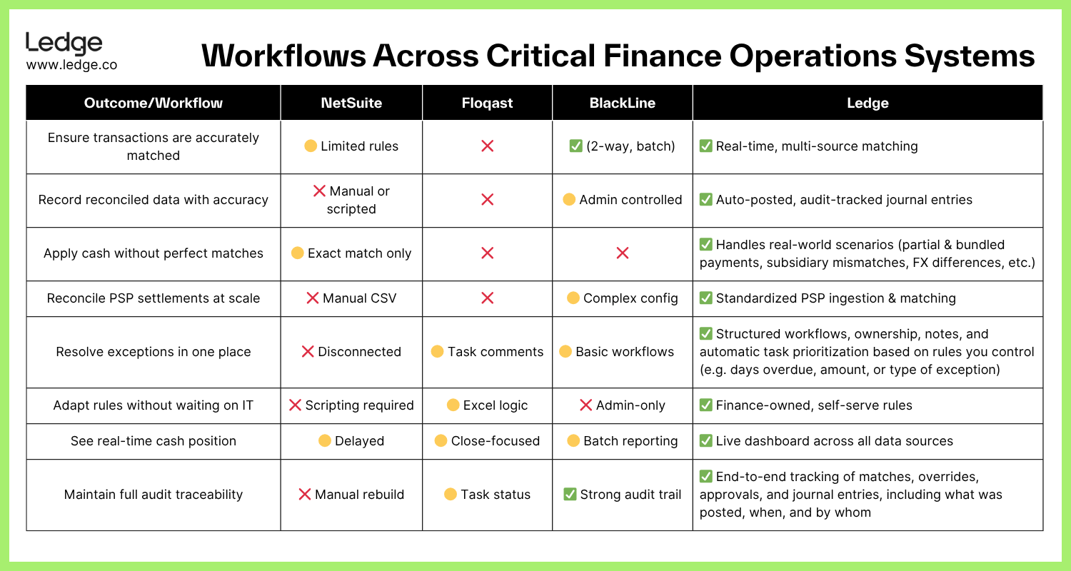 But for all their strengths, these platforms weren’t built for today’s finance reality: fragmented payment stacks, soaring transaction volumes, and cross-system workflows spanning reconciliation, posting, cash application, and real-time cash visibility. What’s needed, particularly in high transaction volumes, is a platform to automate the full operational lifecycle…which is what we’ve built at Ledge.